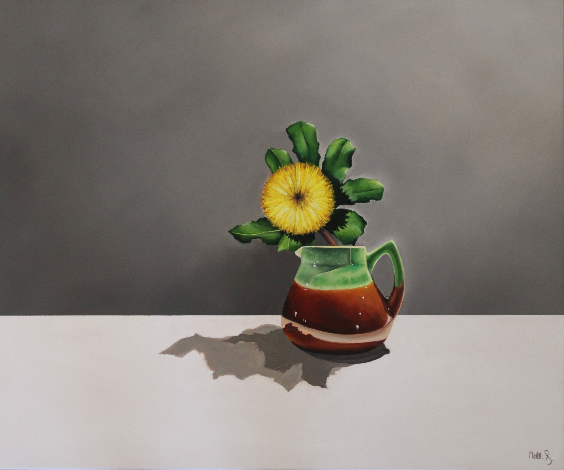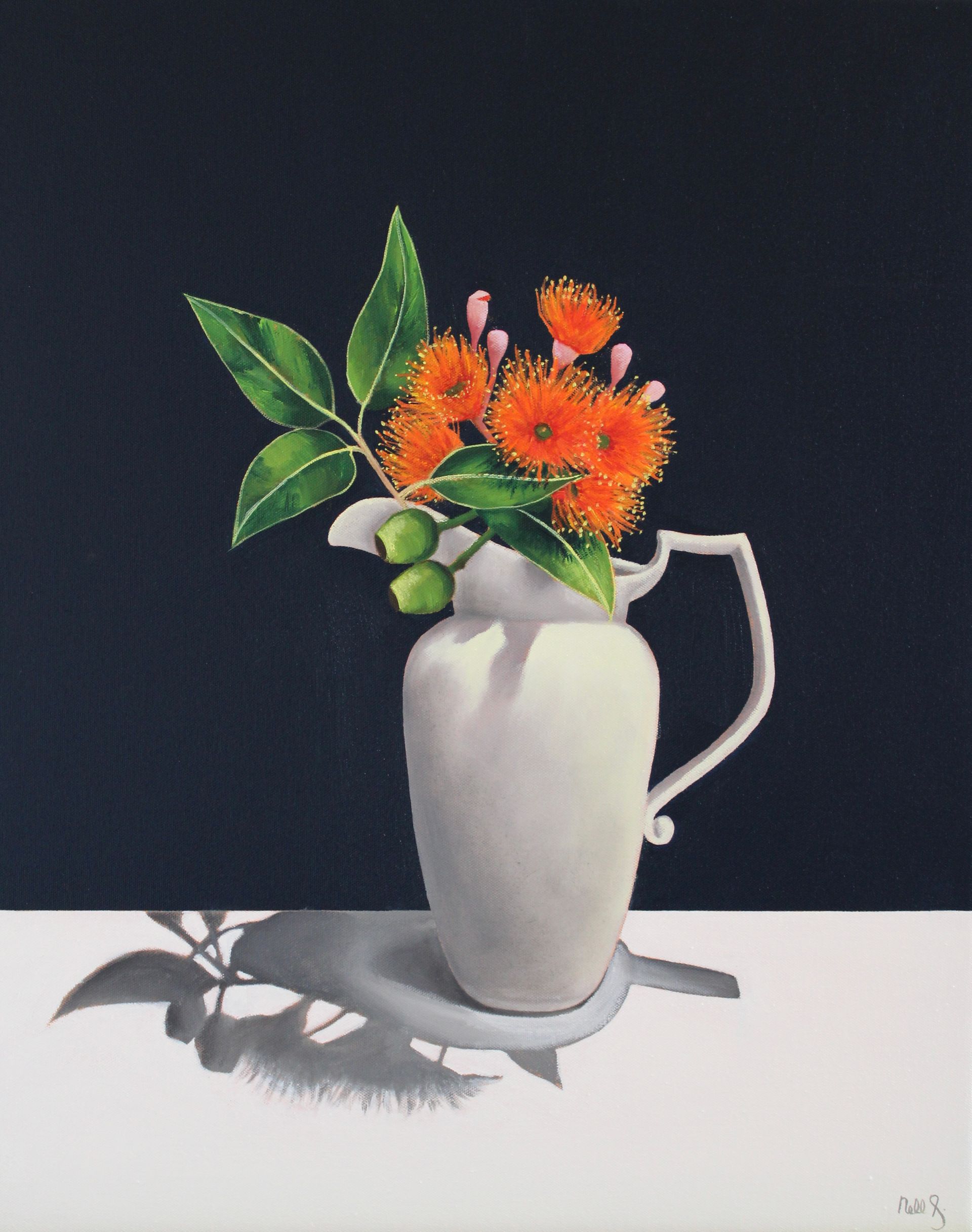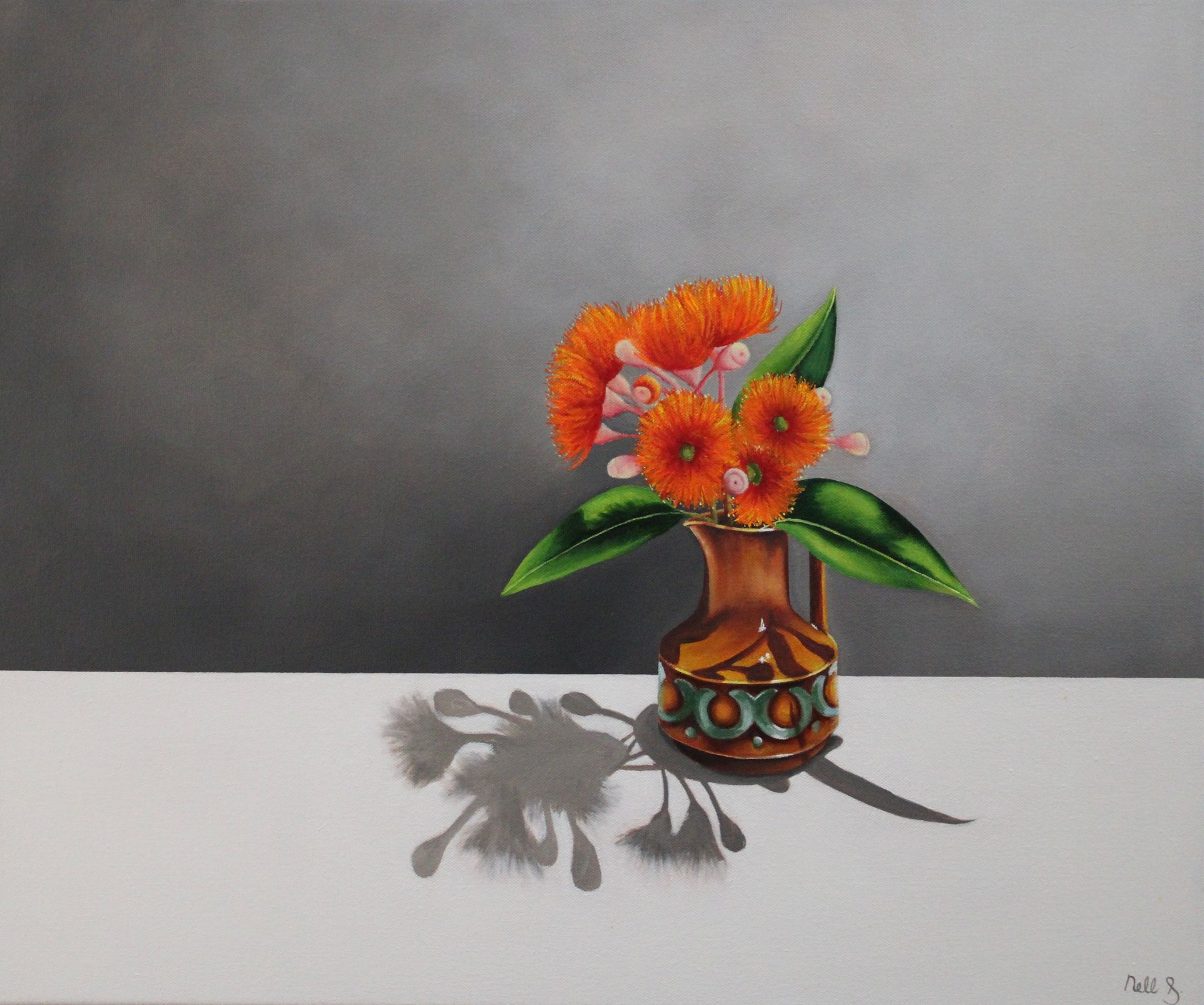 Nell has become fascinated with naturally occurring shapes and curves on her journey. The play of light and shadow. The composition of objects creating balance is key to her work. A simple but bold colour palette completes her paintings. And above all, shadows.