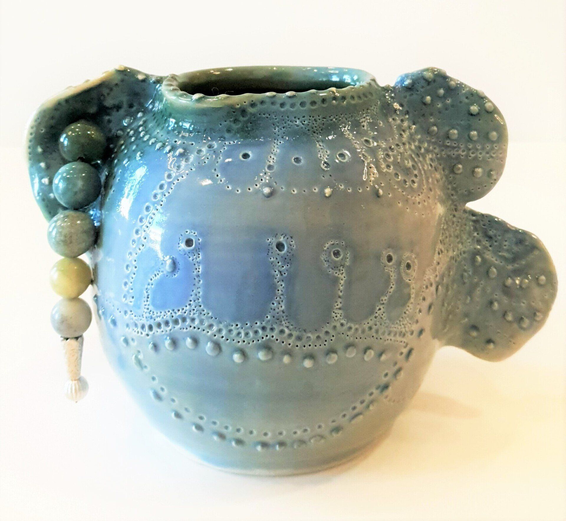 An African Tale is a functional vase that showcases the busy waterhole in the African Savannah. The hippos lazily float in between their blue mud bubbles while ox peckers preen and eat the ticks off their heads. The Leopard watches the scene unfold as he dozes in the midday heat. Playful baboons can be seen scampering and nursing their young. The African lucky beans adorn the neck of the vase. Giraffe’s graze on the green leaves and add a sense of serenity to this story. All is as it should be in the bush today …