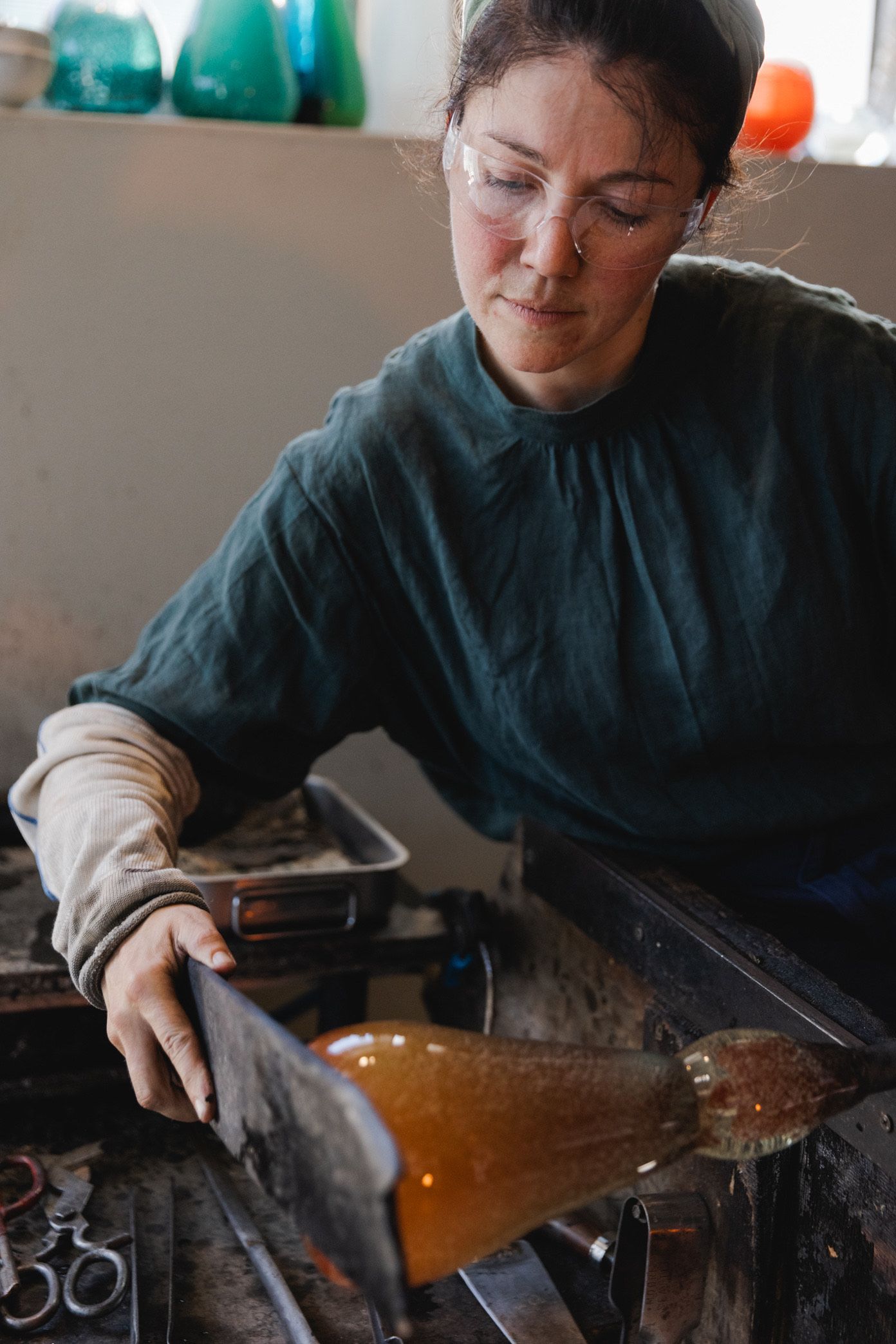 Emma Lashmar is a Boorloo-based artist, passionate about the dynamic and expressive qualities of molten glass. In the studio she plays with the possibilities of this amorphous material, allowing the mesmerising process of heating and cooling, breathing and shaping, flux and flow to sculpt each form.