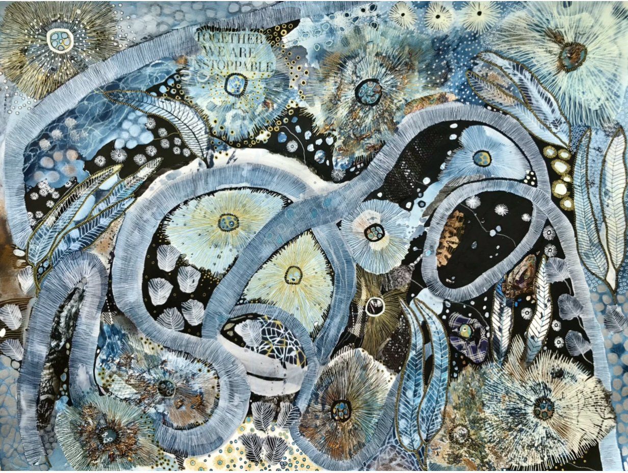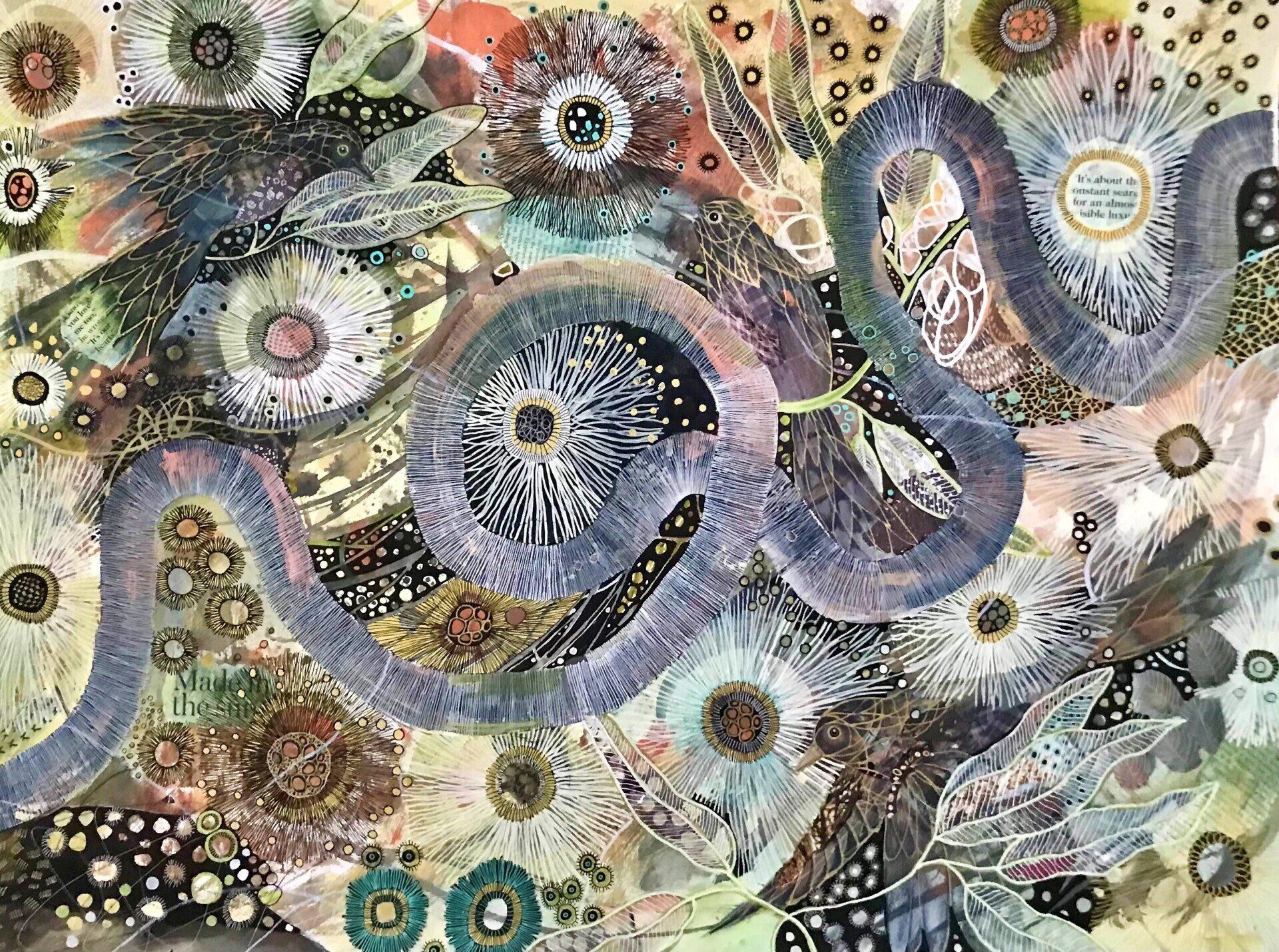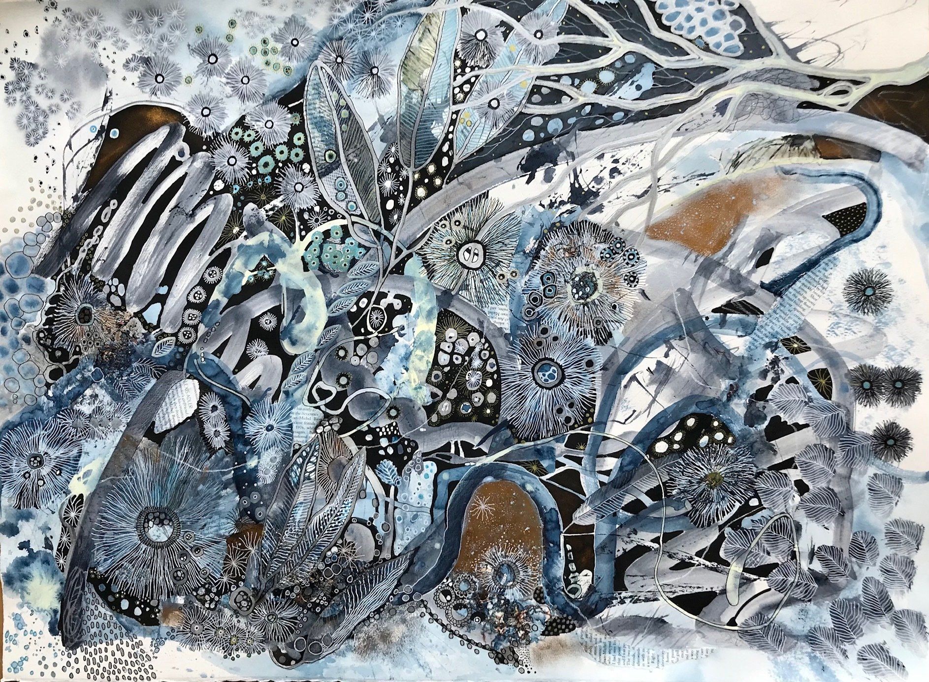 In her more detailed drawings and reflections she is investigating habitat and the preciousness of the natural world, while her more abstracted landscapes which include tangles of lines, strokes and marks (some spontaneous, some careful and following observation) reflect her response to the history and soul of a place as well as an awareness of movement and light.