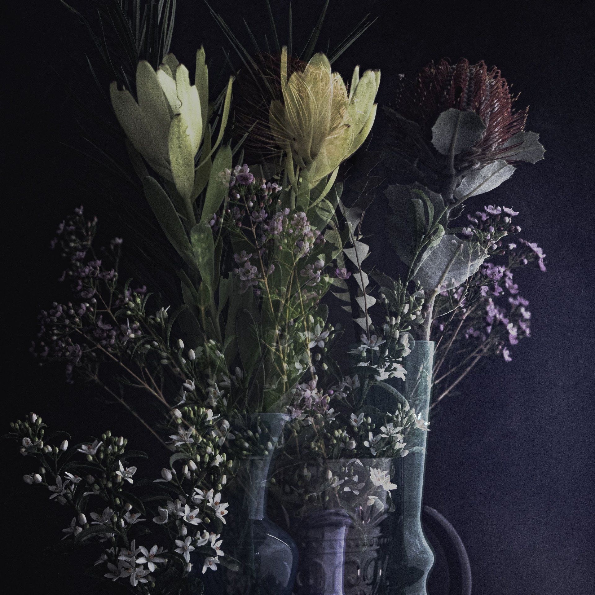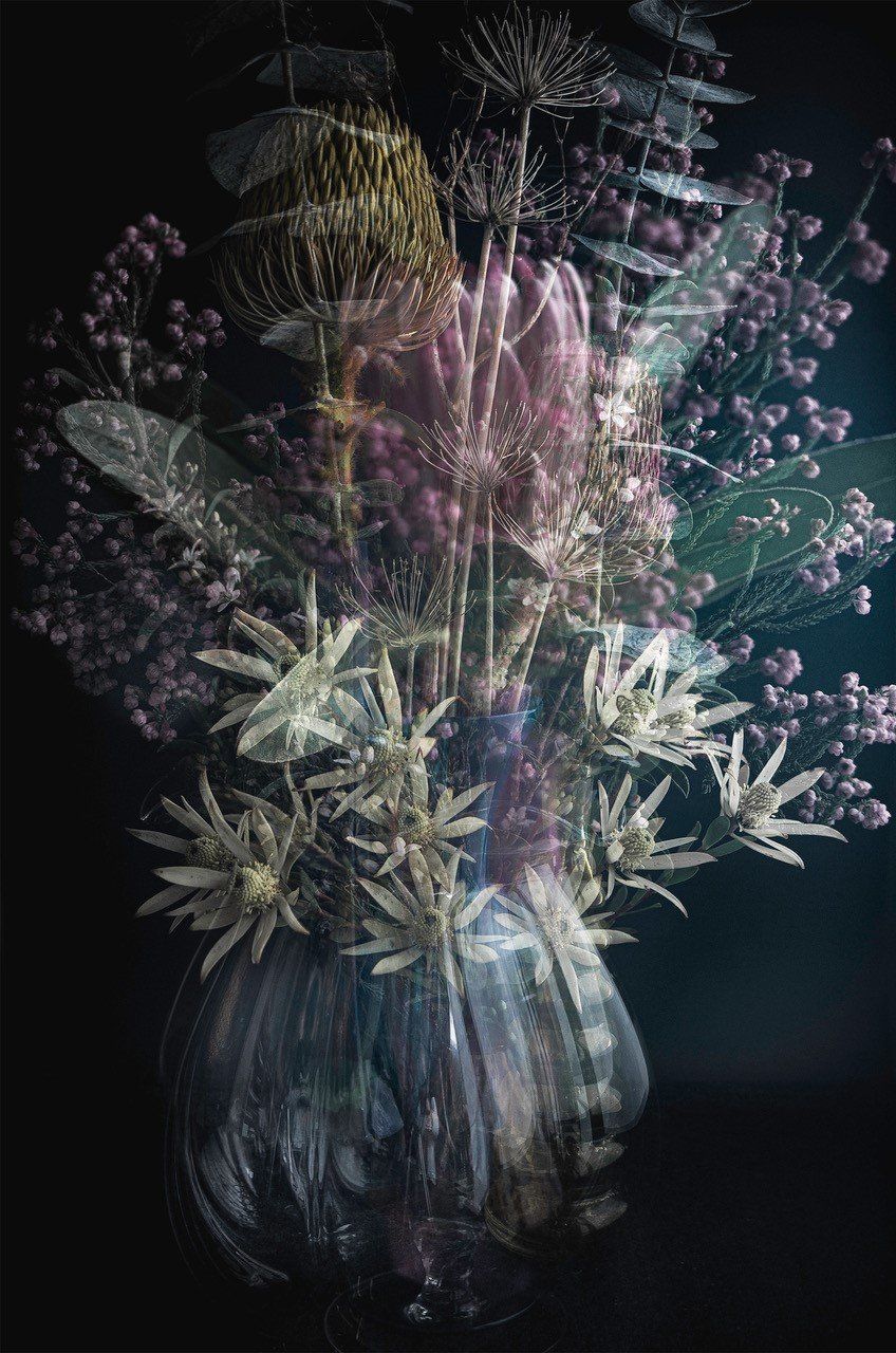 Flora is a reoccurring theme for Nell with a limitless supply with every season. Nell creates a bouquet of flora, then rearranges them focusing on their extraordinary beauty, shape, contrast and composition. Rearranging and enhancing these elements allows her to satisfy the search for beauty and order. She then composes layers in the camera to achieve the final image, with minor adjustments post production.
